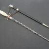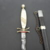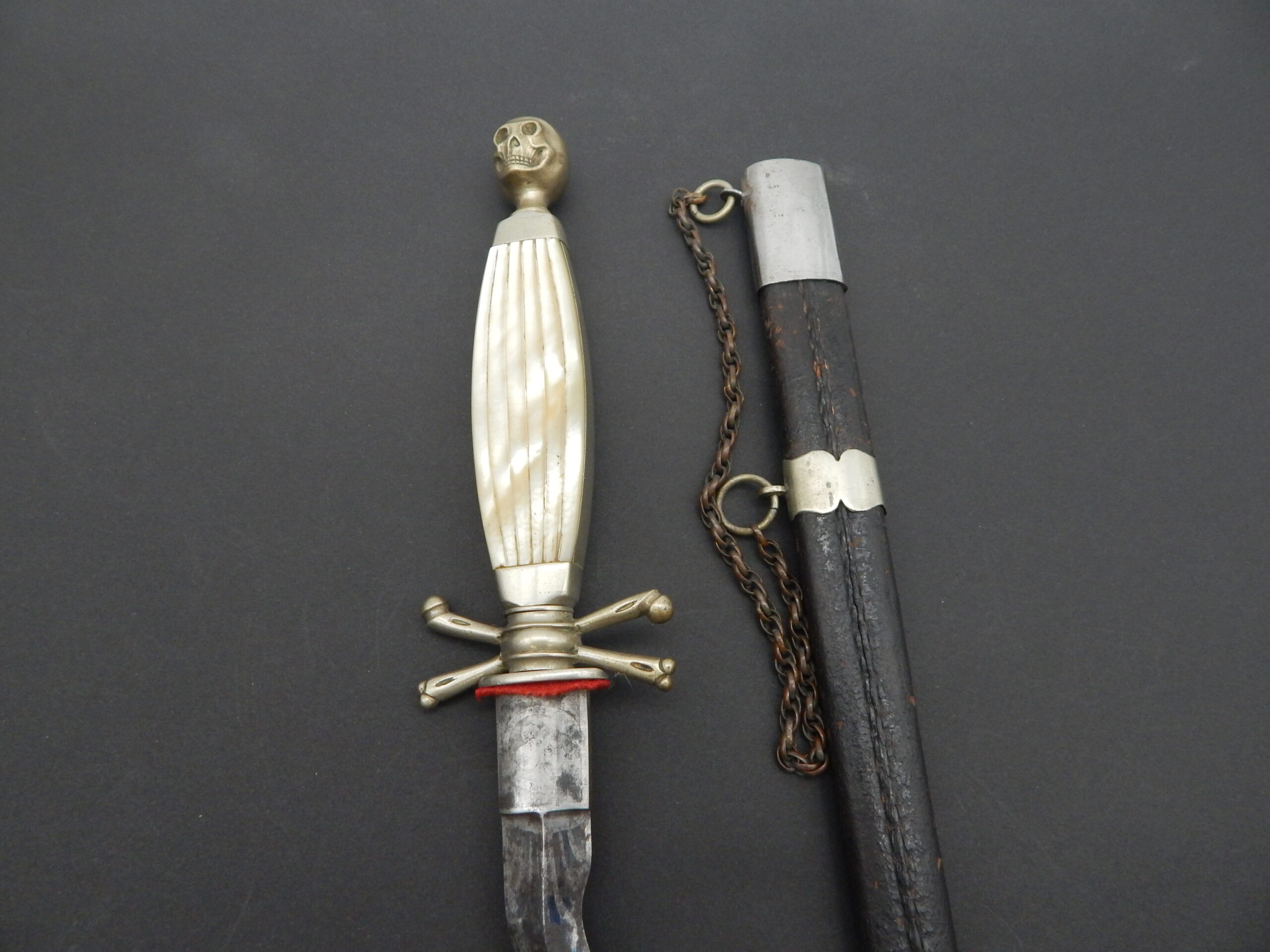 19th century poniard with metal and leather scabbard. handle with mother of pearl, skull and bones . flaming blade. 54 cm